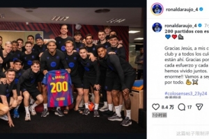 阿勞霍此役為巴薩替補出場,這是他為巴薩出戰(zhàn)的第200場比賽,阿勞霍獲贈紀念球衣,他在社媒曬出與全隊的合照,并寫道:“身穿巴薩球衣的第200場比賽。