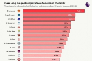本賽季英超門將在撿球或接球后的出球時(shí)間(從慢到快排列)