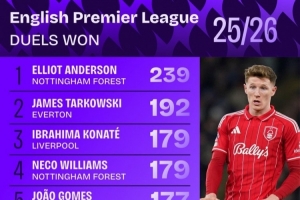 本賽季英超對抗成功次數榜:安德森239次居首,塔爾科夫斯基次席