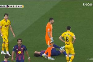 比賽第37分鐘,西班牙人的一次進攻,巴薩中衛(wèi)馬丁突然痛苦倒地。但隨后他在隊醫(yī)的處理后看起來問題不大,回到了比賽。