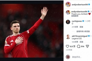 羅伯遜將在本賽季結束后離開利物浦,他在社交媒體上曬出謝場的照片,配文:“謝謝你,安菲爾德。”