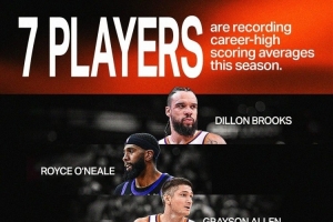 體育資訊4月12日訊 太陽官方社媒更新動態,曬出了本賽季隊中7位球員創造了職業生涯場均得分新高的海報。