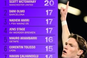 體育資訊4月14日訊 數據機構squawka統計了上賽季至今的五大聯賽中前衛進球榜,麥克托米奈居首。