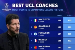 歐冠主帥積分榜:安切洛蒂、瓜迪奧拉、弗格森前三,西蒙尼第六