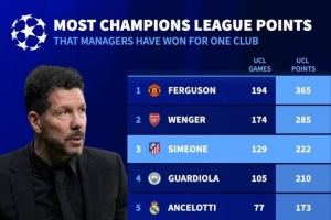 執(zhí)教單一俱樂部歐冠拿分榜:弗格森365分、溫格285分、西蒙尼222分