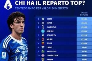德轉列意甲各隊中場總身價排行:科莫1.66億歐居首,國米第二
