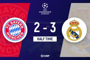 姆巴佩破門,維尼修斯助攻!第42分鐘,維尼修斯左路單兵推進后橫傳,姆巴佩插上冷靜推射破門,拜仁2-3皇馬!總比分拜仁4-4皇馬!↓
