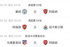體育資訊04月16日訊 阿森納淘汰葡萄牙體育,晉級歐冠半決賽,繼續在英超和歐冠雙線爭冠。4月剩余比賽中,阿森納將接連迎來曼城、紐卡和馬競的挑戰。