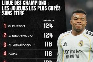 體育資訊04月16日訊 外媒《Onze Mondial》統(tǒng)計(jì)了未曾奪得歐冠冠軍的球員中,這些球員的歐冠出場(chǎng)次數(shù)排行,姆巴佩98場(chǎng)排在歷史第9位。布馮、伊布124場(chǎng)并列第一。