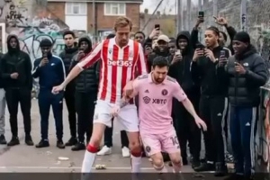 克勞奇社媒曬出AI視頻,內容為他在街頭足球中搶斷梅西并破門,然后做出標志性的機械舞慶祝動作。