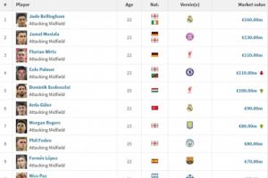 進攻型中場身價榜:貝林1.6億歐居首,索博1億歐超居萊爾升第五