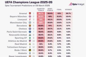 OPTA預測歐冠冠軍:阿森納斷層第1,仁軍城薩2-5位,皇馬1.9%第11