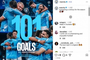 本賽季45場(chǎng)各項(xiàng)賽事打進(jìn)101球,曼城曬海報(bào)慶祝進(jìn)球破百