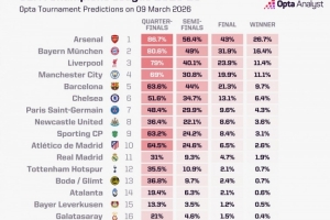 Opta超算預(yù)測(cè)晉級(jí)歐冠8強(qiáng)概率:阿森納86.7%、拜仁80.6%、皇馬31%