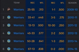 庫里生涯各賽季出戰(zhàn)與否勇士戰(zhàn)績(jī)&勝率:本賽季缺席時(shí) 勝率降23%