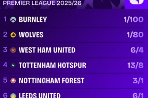 本賽季英超降級賠率排名:伯恩利居首,狼隊次席,熱刺第四