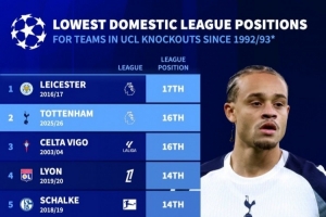 熱刺是聯(lián)賽排名第二低歐冠淘汰賽球隊(duì),僅高于16-17賽季萊斯特城