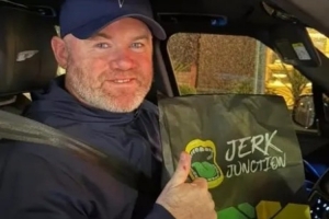 魯尼在社交媒體展示了他從威爾姆斯洛的Jerk Junction餐廳買(mǎi)的外賣(mài),這位曼聯(lián)歷史最佳射手在車(chē)?yán)锬弥澄锇b袋,咧嘴笑著并對(duì)鏡頭豎起大拇指。