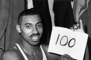 “最后一分鐘,羅杰斯傳給張伯倫,張伯倫射失;泰德·盧肯比爾抓到籃板球再給張伯倫,再射失;盧肯比爾繼續抓到籃板,傳球給盧克里克,盧克里克將球傳到張伯倫手里。比賽還有46秒,張伯倫高高跳起,球進籃筐,100分。”
