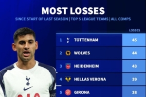 熱刺上賽季以來各項賽事輸掉45場,五大聯賽最多