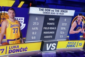 賽前轉播方對比了湖人球星東契奇和掘金球星約基奇交手時的數據,具體如下: