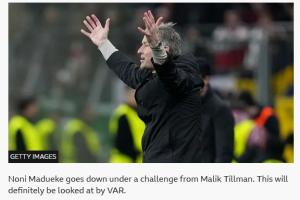 在BBC的直播間中,對這個點球的判罰描述為:馬杜埃凱在與蒂爾曼的對抗中倒地,這肯定會由視頻裁判進行審查。英格蘭邊鋒幾乎沒受到任何接觸,但判罰維持不變。