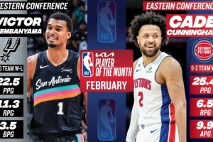體育資訊3月4日訊 今日NBA官方宣布,馬刺球星文班亞馬和活塞球星坎寧安分別被評(píng)為西部和東部二月份最佳球員。