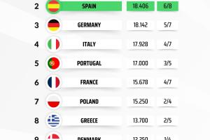 西班牙排名第二,只領(lǐng)先德國0.264分。