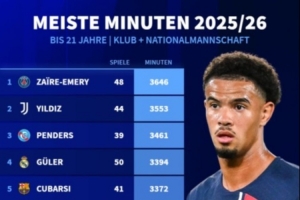 五大聯賽U21球員出場時間榜:埃梅里居首,伊爾迪茲第2亞馬爾第7