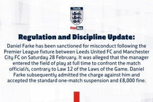 英足總發布公告:“丹尼爾·法爾克因在利茲聯對陣曼城的比賽結束后存在不當行為而受到處罰。據指控,該主教練在全場結束時進入比賽場地與裁判發生對峙,此舉違反了《足球競賽規則》第12條。丹尼爾·法爾克承認該項指控,并接受標準的一場停賽處罰,以及8000英鎊罰款。”