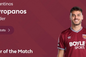頭球扳平,英超官方:馬夫羅帕諾斯當(dāng)選西漢姆1-1曼城全場(chǎng)最佳
