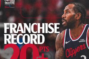 倫納德單賽季連續45場比賽得分20+,超越鮑勃·麥卡杜獨占快船隊史第一。
