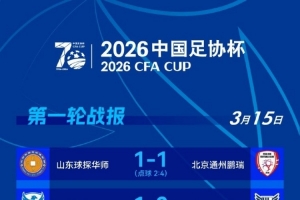 體育資訊3月15日訊 2026年足協杯第一輪第三個比賽日結束,北京通州鵬瑞、寧夏平羅恒利、武漢聯鎮、聊城傳奇綠業春、泉州青工走走紡織五支球隊晉級。